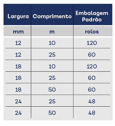Veja a tabela com nossas medidas fabricadas e as quantidades de rolos por caixa: